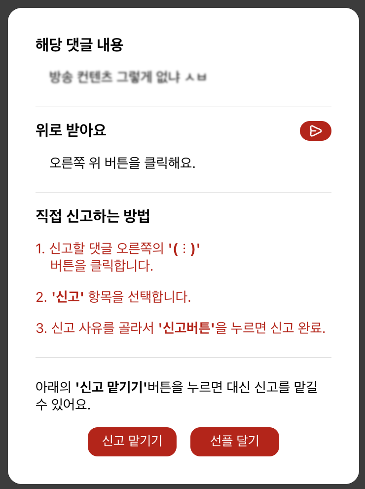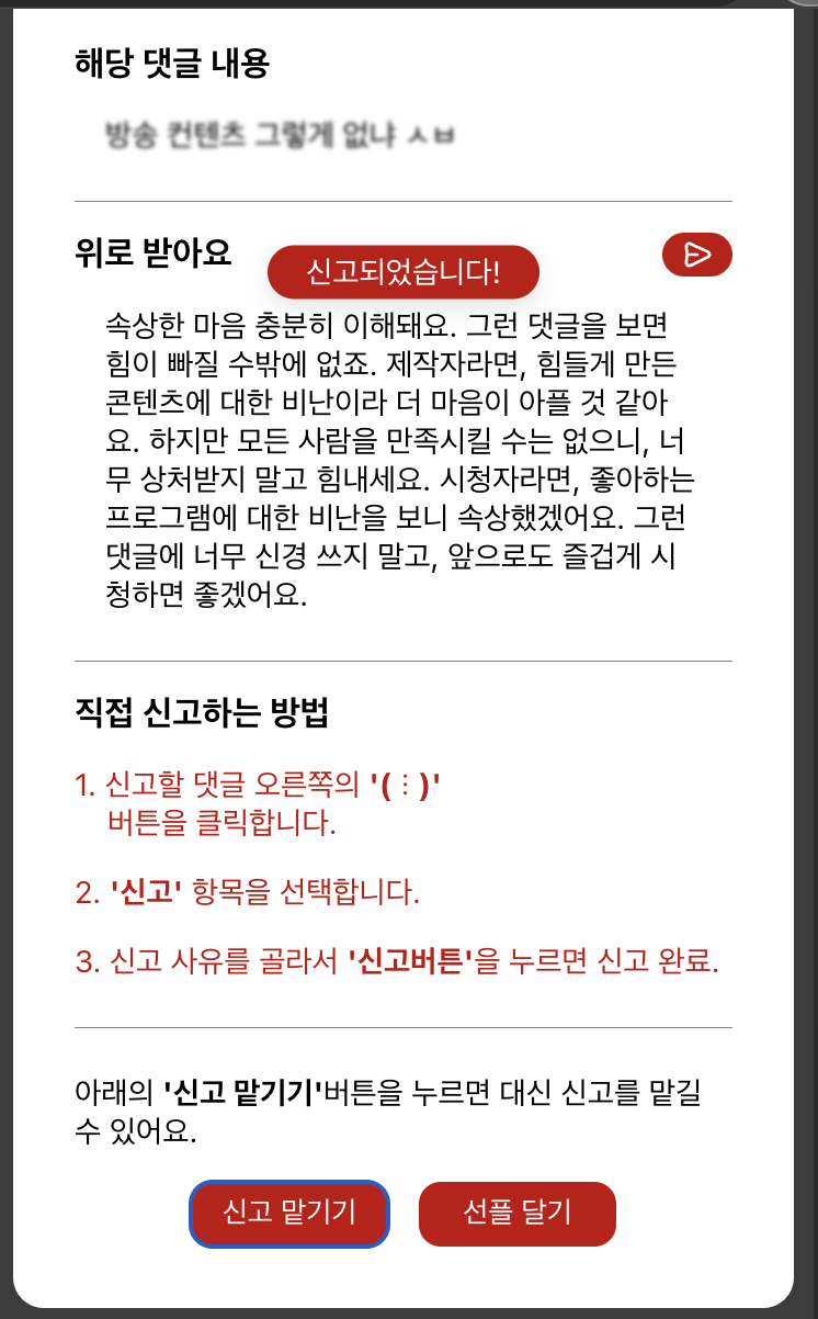 "신고 하기"를 누르면 해당 댓글이 인식되고, 블러처리가 됩니다.