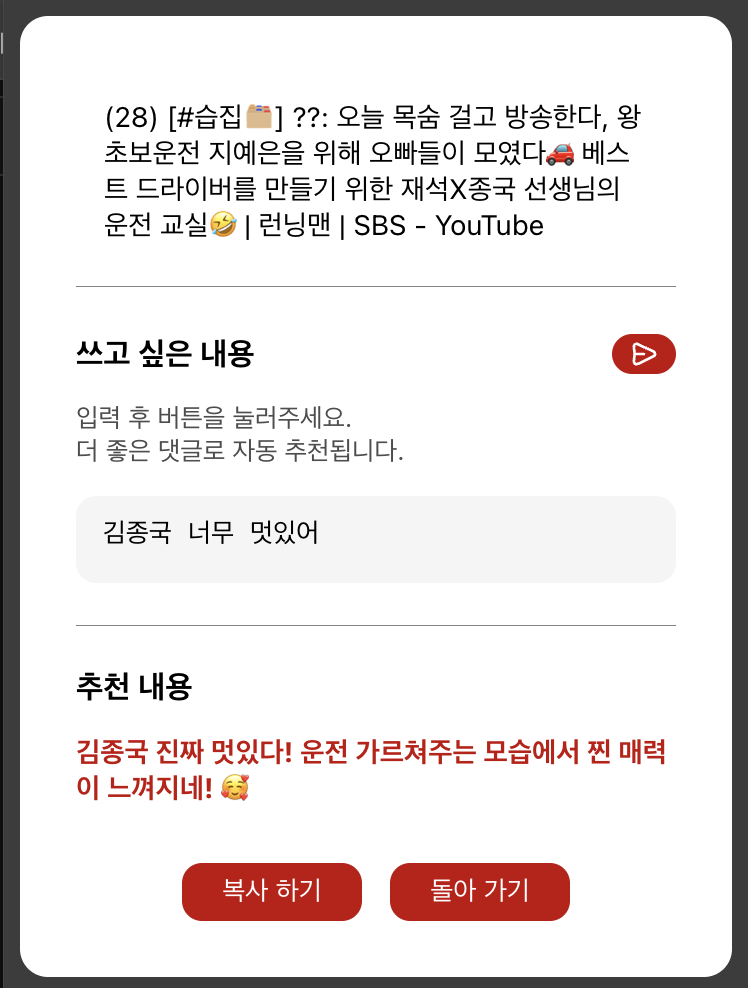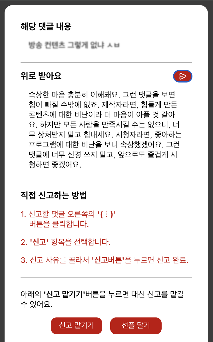 그리고 "위로 받기 (우측 상단)"을 누르면 악플을 본 시청자를 위로해주는 글을 AI가 작성해줍니다.